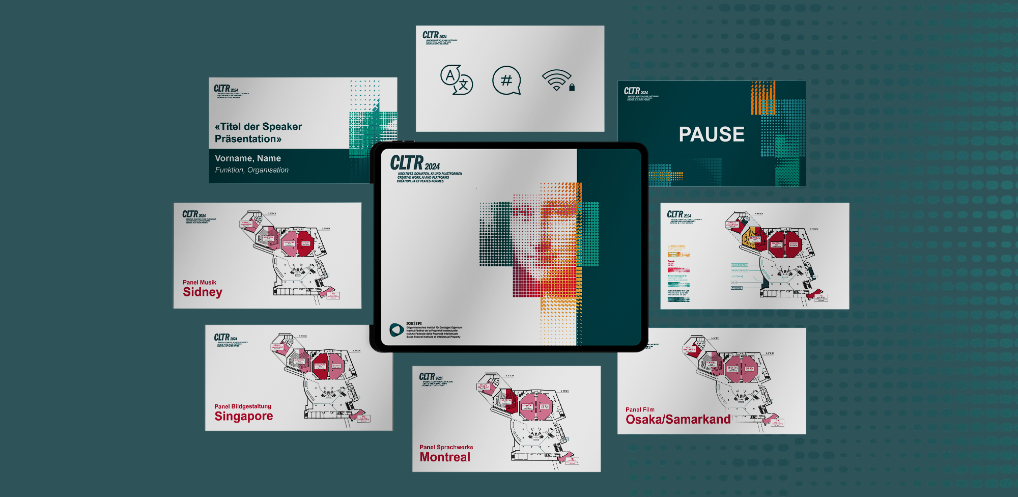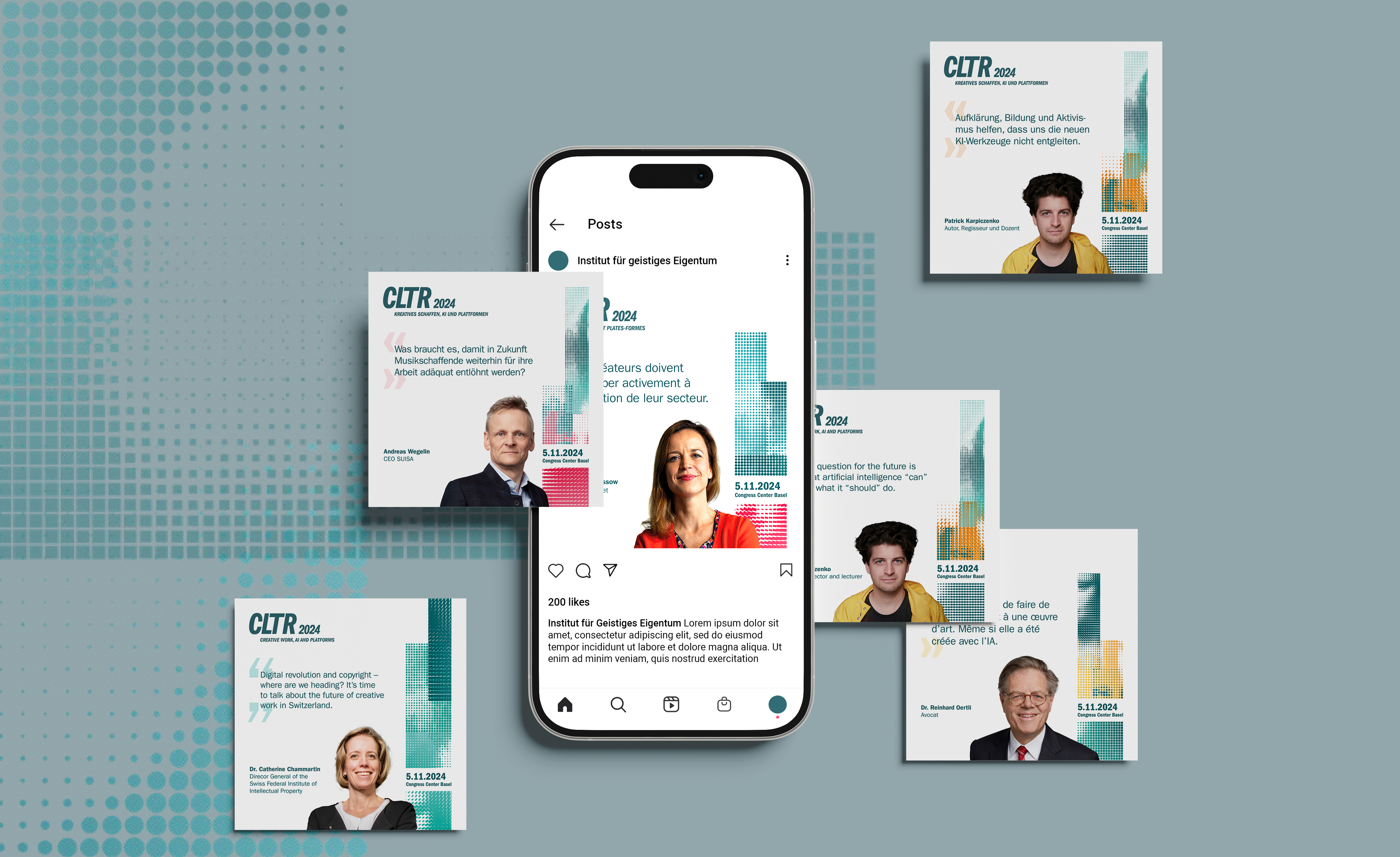 This concept is the result of a winning pitch for the branding of the conference „CLTR 2024 – Creative Practice, AI and Platforms.“ It explores culture from the perspective of its creators. The Mona Lisa stands as the epitome of culture and a symbol of how images are continuously reinterpreted over time—whether intended or not. It raises timely questions: Where do artistic rights begin, and where do they end? How is this relationship changing in the age of AI? Visually, the design plays with four partly AI-generated grids that overlay to create ever-changing abstract patterns. The Mona Lisa remains a subtle point of reference, while the grids merge into something new. The IGE’s color palette forms the basis of the visual identity, structuring scenography and acting as a guiding element across all areas.